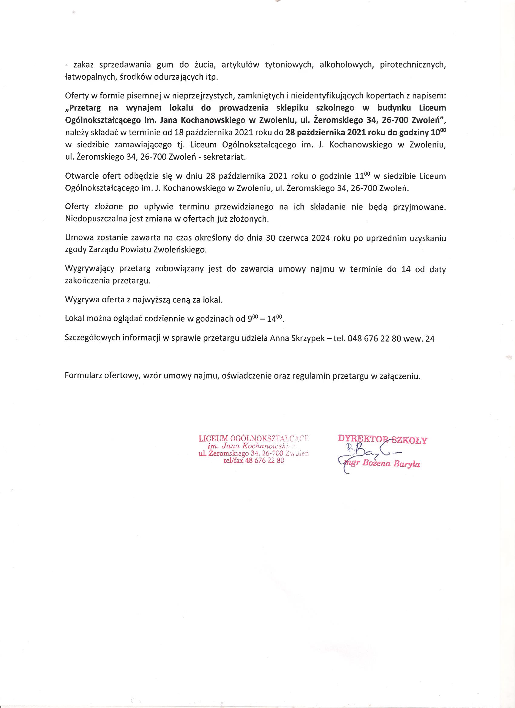 Wynik przetargu na wynajem lokalu z przeznaczeniem na sklepik szkolny.